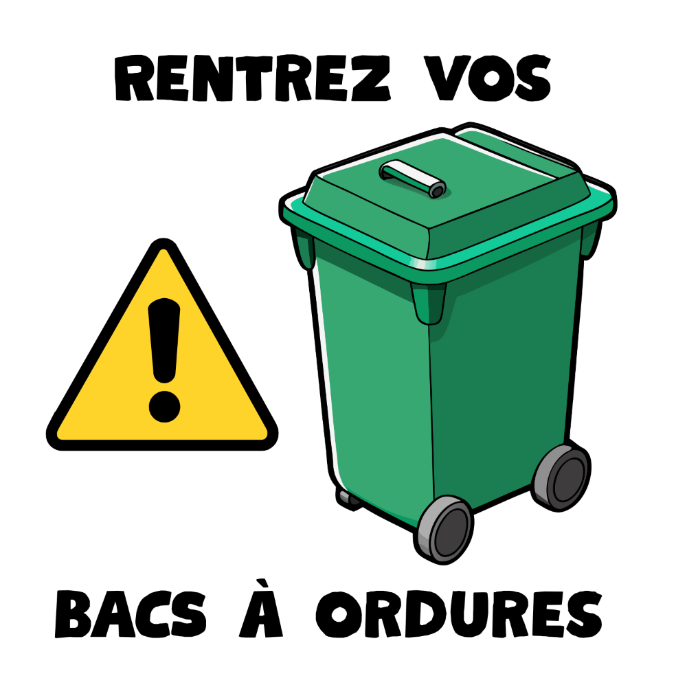 Afin d’éviter tout risque d’accident ou de dégradation, nous vous recommandons de rentrer vos bacs à ordures. À défaut, ils pourraient être renversés ou déplacés par le vent et resteront sous la responsabilité de leur propriétaire.