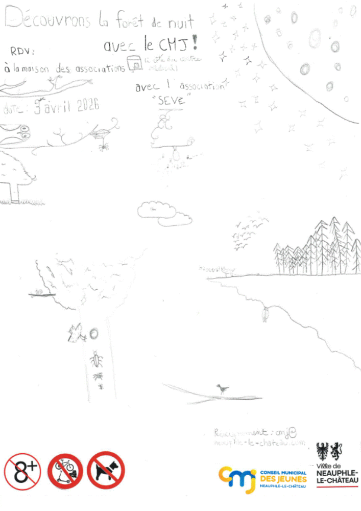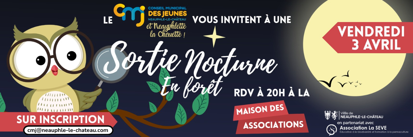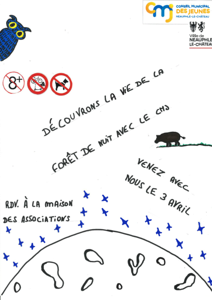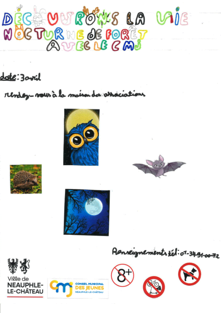Dans le cadre de leur projet « Découverte de la vie nocturne en forêt », le Conseil Municipal des Jeunes (CMJ) vous invitent à une sortie nocturne en forêt. Au programme : ouvrir grand les yeux (et les oreilles !) pour partir à la rencontre de la faune et de la flore qui s’animent une fois la nuit tombée.